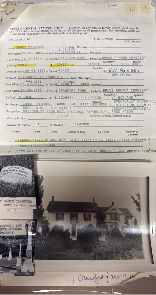 As a young boy (about age 4), James Crawford lived with his parents, in Buffalo, New York (for two years) before moving with his family to Macomb County, Michigan in 1833. On June 28, 1856, James married Elizabeth Borland (born July 3, 1829, in Ayrshire and died August 29, 1912, in Armada). They had a son Thomas Borland Crawford (born December 10, 1858, in Armada and died January 11, 1940, in Akron, Summit County, Ohio).